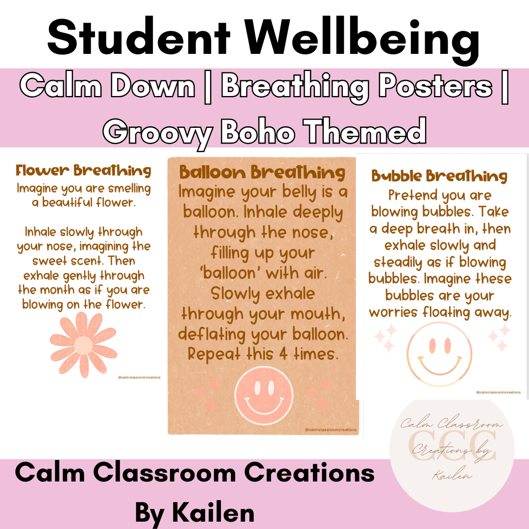 Student Wellbeing | Calm Down Breathing Posters | Groovy Boho Themed
